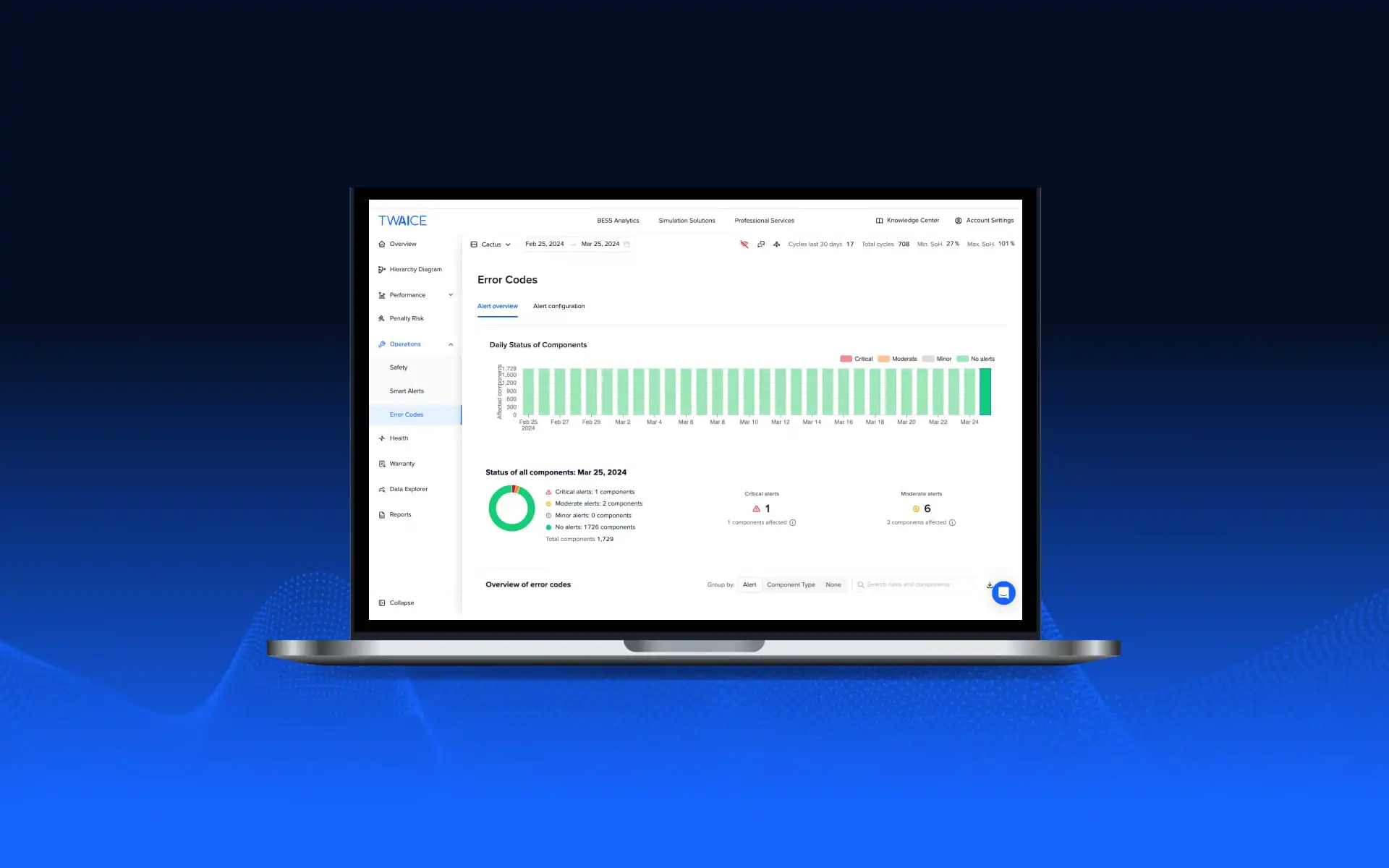 Error codes are generated across multiple BESS subsystems, but making sense of them at scale is challenging. TWAICE’s new Error Codes feature pulls together native component errors (e.g. from BMS, PCS and HVAC) into a single, structured view – helping teams prioritize issues, spot patterns, and process error codes faster.